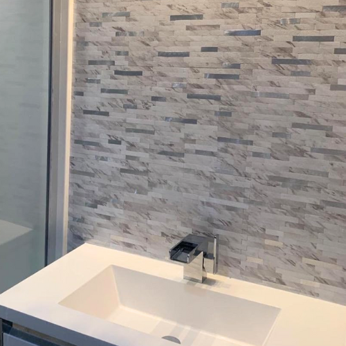 Fliesen auf Matte in Weiß Silber eignen sich hervorragend als elegante Akzentwand. Die Kombination aus Steinoptik, Marmor und Silber erzeugt einen edlen Blickfang, ideal für Wohnzimmer, Eingangsbereiche, Küchen oder moderne Geschäftsräume.