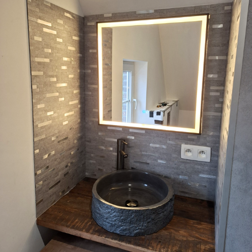 Ihre Wand ist nun vollständig renoviert. Genießen Sie die moderne Fliesen und das professionelle Ergebnis Ihrer Arbeit. Mit selbstklebenden Fliesen schaffen Sie schnell und unkompliziert eine stilvolle neue Raumwirkung.